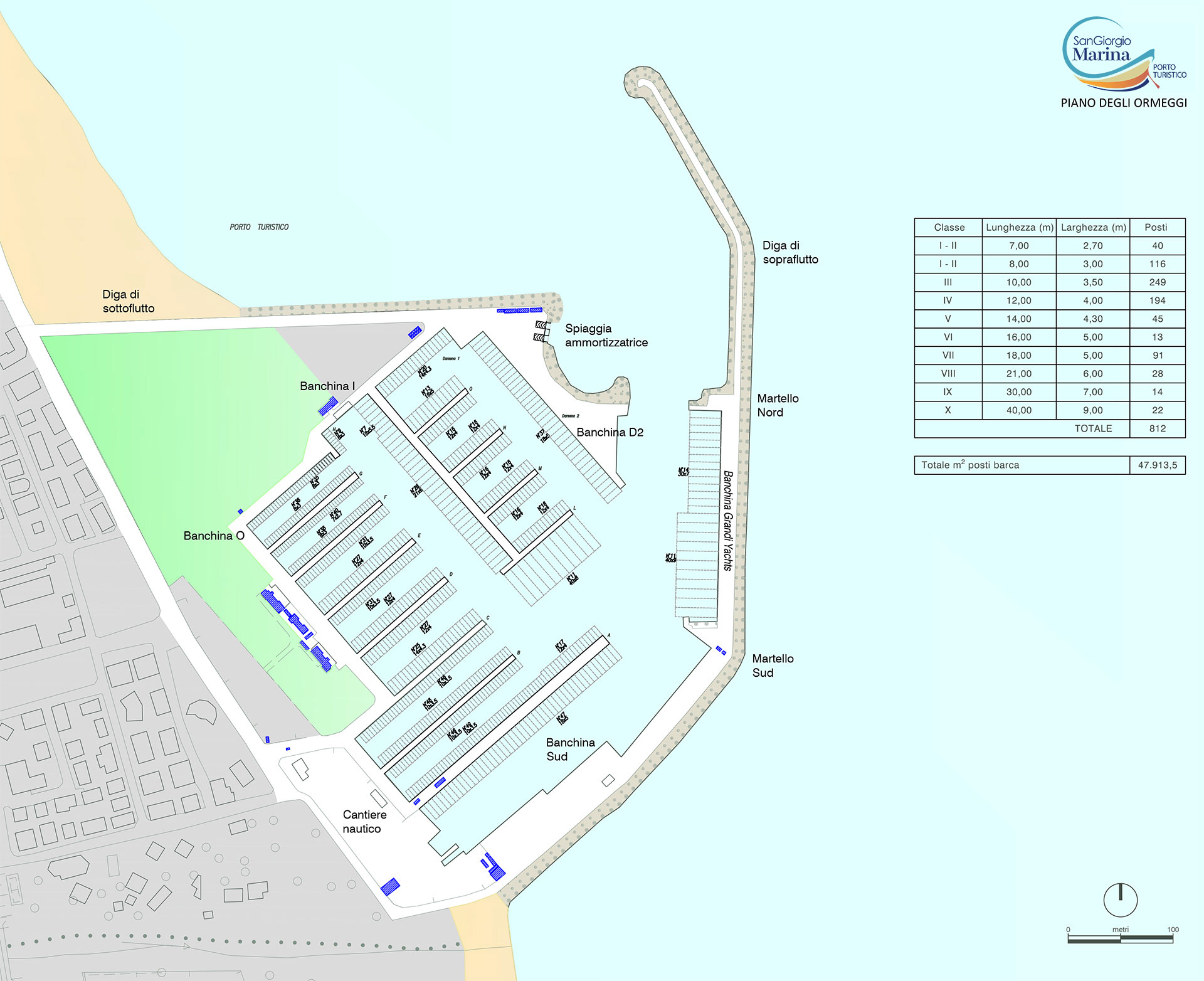 L'infrastruttura per l'approdo si sviluppa su 12 pontili che possono ormeggiare 800 imbarcazioni di lunghezza tra gli 8 ed i 50 metri.